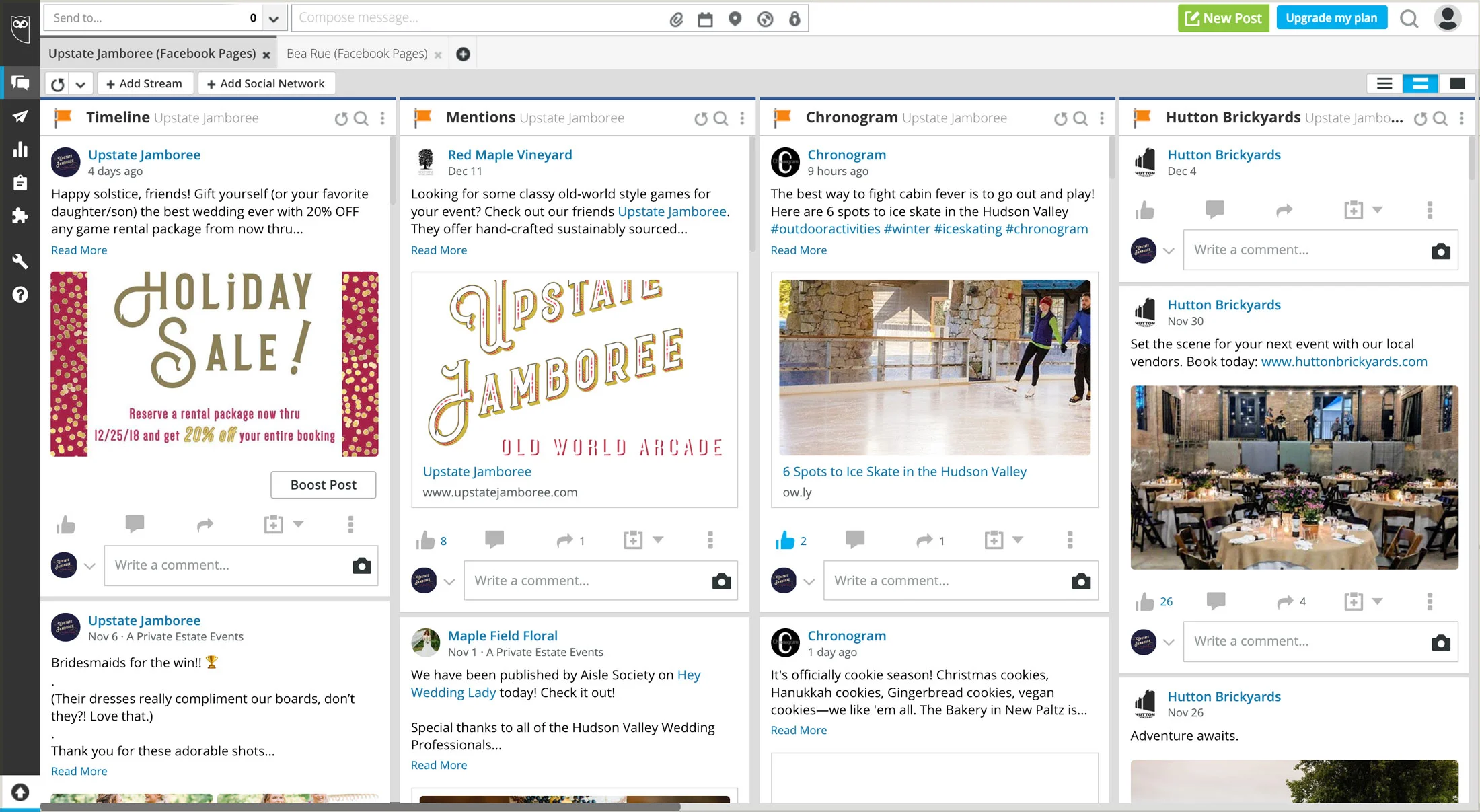 Hootsuite’s free plan allows you to manage up to 3 social media profiles in one place, all with one password. Schedule up to 30 posts in advance each month, track mentions, follow topics of interest with the custom streams feature, engage with followers, and measure the effectiveness of your content with analytics reports. Hootsuite also offers free social media courses for those who want to dive deeper, as well as a robust help center and community forum.