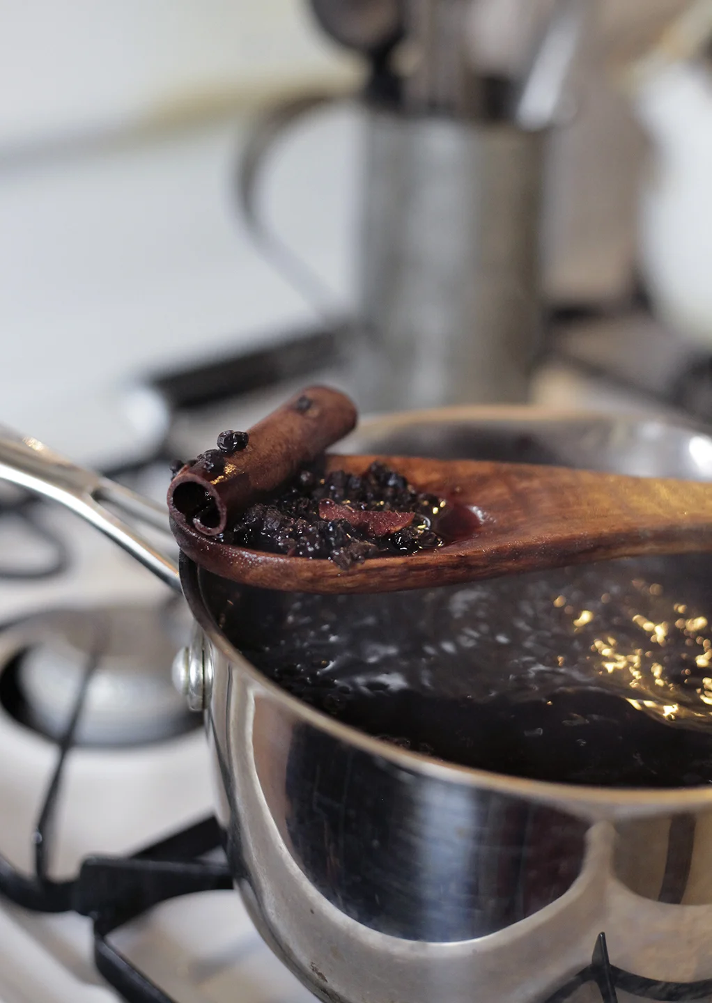 1. Bring water, elderberries, cinnamon, cloves and ginger to a boil, then cover (allowing for a bit of ventilation) and reduce to a simmer for 45 minutes. The liquid should reduce by about half its original volume in this time.