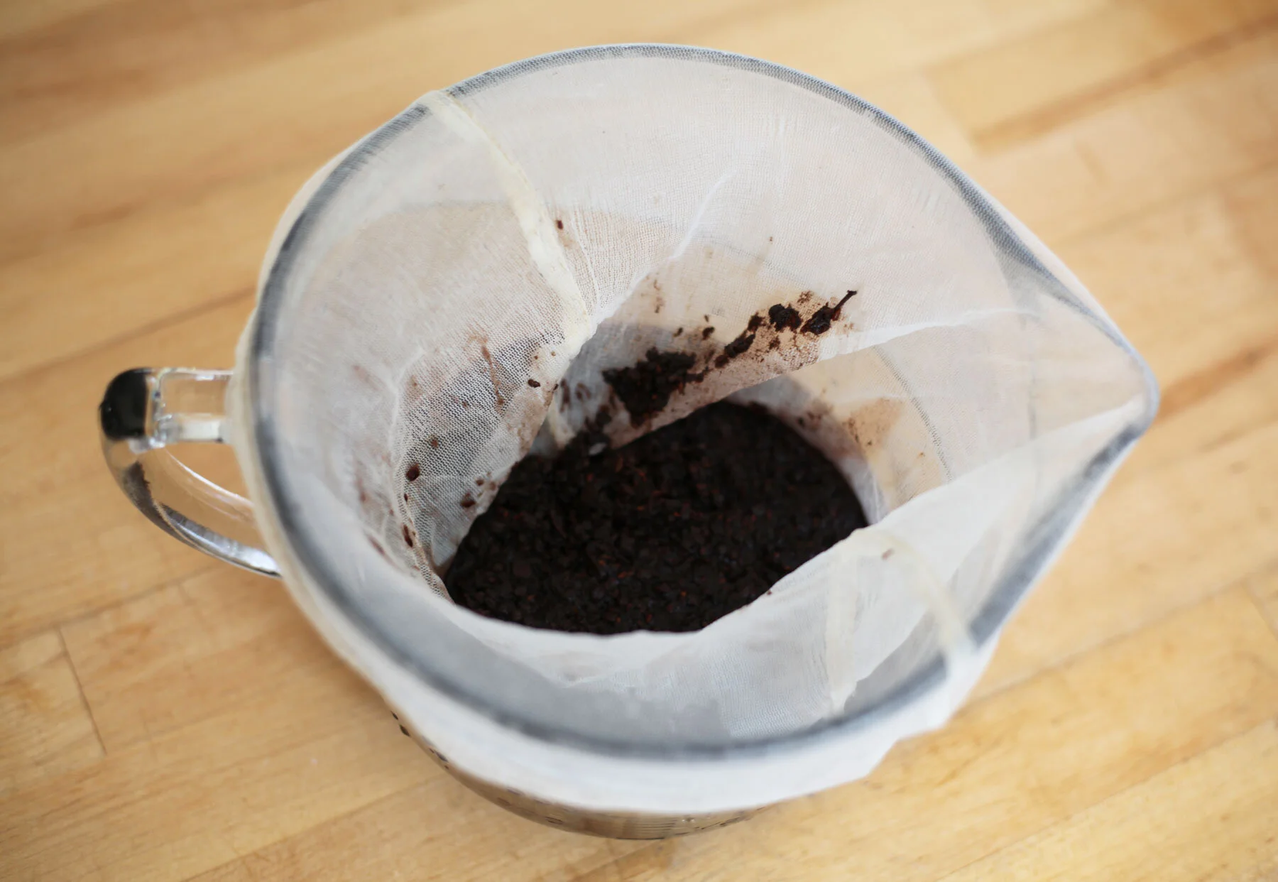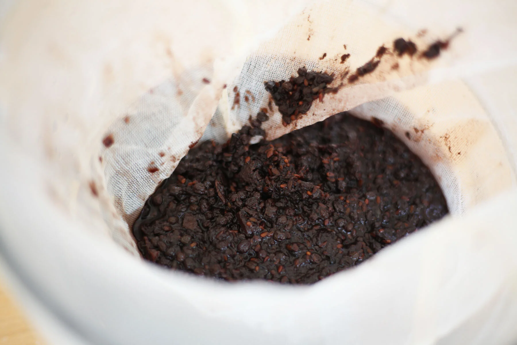 2. Remove from heat and gently mash the berries with a slatted spoon. Allow to cool until manageable. Pour contents through a cheesecloth into a glass jar or bowl, squeezing out as much liquid as possible. You can now compost what remains in the cheesecloth.