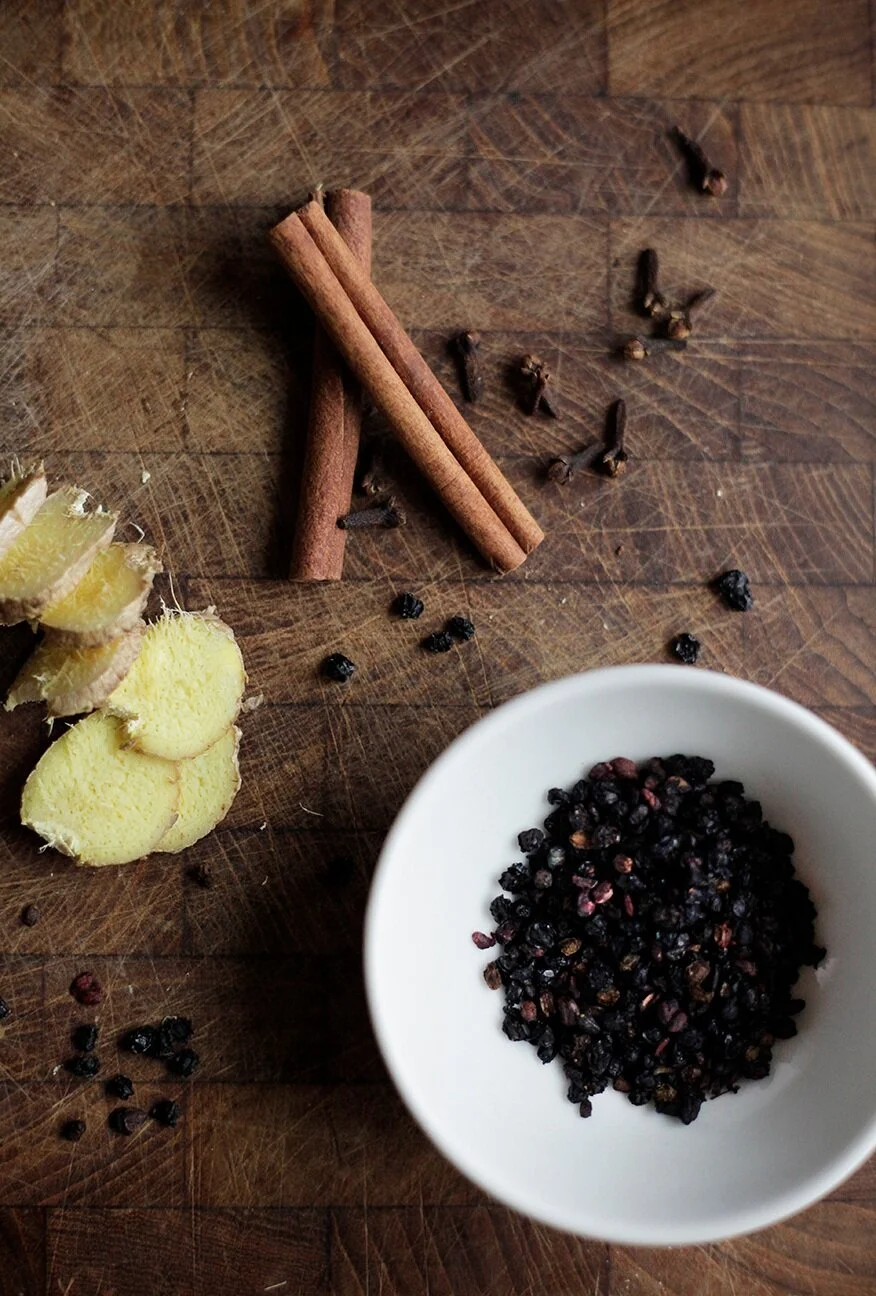 My auntie turned me on to elderberries a couple months ago. One bright December afternoon we sat around her kitchen table excitedly sharing our latest DIY projects and recipes. Suddenly she went quiet, her eyes widening to the other side of the room. She giddily reached for an unmarked wine bottle. At first I couldn't believe she was pedaling booze this early in the day, but then thought, This is Auntie we're talking about- it's got to be some kind of homemade potion. And sure enough it was. She asked if I had ever tasted her elderberry syrup as she poured out a couple ounces of the dark, viscous liquid, no doubt a generous portion for something so rich. Familiar with her alchemical genius (she's not only a licensed aromatherapist, but an incredible southern cook) I trusted it would be delicious. I sipped it like an aperitif, a slight touch of brandy lending it the depth and complexity of one. It was bright and jammy with just the right amount of sweetness to balance that elderberry tang. As I savored my last sip, she called it "a flu shot in a bottle." Could something this delicious really be that good for you?